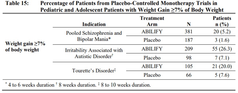 - Metabolic changes: Antipsychotics as a class can cause metabolic changes such as high blood sugar, high cholesterol and body weight changes. Compared to many other second generation antipsychotics, aripiprazole has a lower risk to cause these changes. Hyperglycemia and dyslipidemia is mostly comparable to placebo, so lets focus on weight gain. In adults, there is a chance of weight gain for example in patients with schizophrenia, 8.1% of aripiprazole treated patients gained 7% body weight compared to 3.2% of placebo treated patients. Pediatric patients had a higher chance of gaining weight. Weight gain was seen in 20% or more being treated for Tourette’s or irritability associated with Autism.