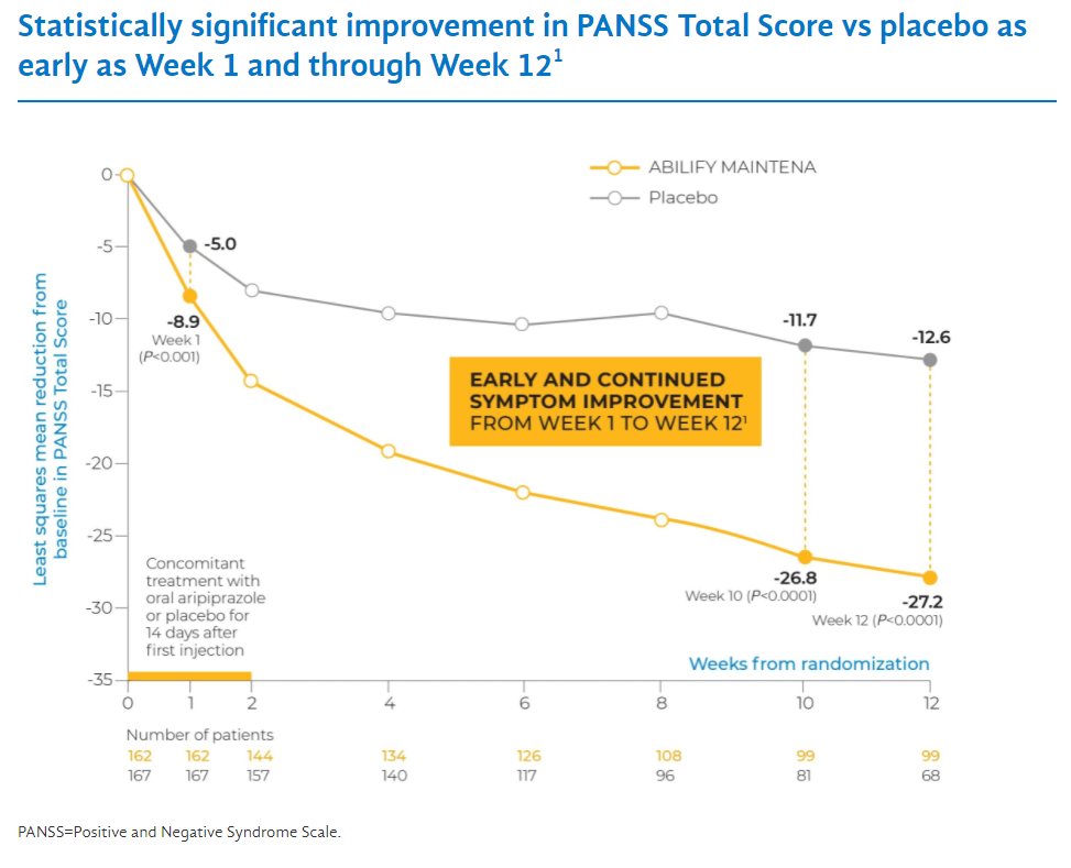 Let’s compare how effective each one is. In the Abilify Maintena trial, patients had an initial PANSS score of 103. 12 weeks into treatment the average PANSS score decreased by 27.2 points. In the Aristada trial, the baseline PANSS score was around 92. 12 weeks into treatment the PANSS score decreased by around 21 points. So it is not comparing apples to apples because the patients were more sick in the Abilify Maintena trial. Abilify Maintena has some advantages such as also being approved for bipolar disorder, and Aristada has some advantages such as the option to dose every two months rather than every month.