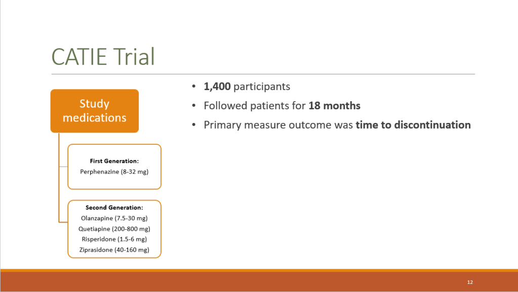 A famous study called the CATIE trial compared some of the antipsychotics in 1,400 patients. They followed the patients for 18 months. A general conclusion of the trial was that the antipsychotics seem to be as effective as each other, so the choice of the agent should be based on side effects.5