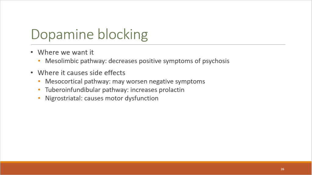 The first set of side effects are from blocking a receptor in the brain for a neurotransmitter called dopamine. We are able to target specific receptors, but we aren’t good at targeting a specific pathway or area of the brain.